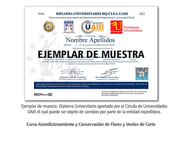 *Una vez superado el Programa y previo pago de las tasas de expedición, el alumno podrá solicitar su Diploma-Título de formación permanente expedido por DQ Agencia Universitaria, el Círculo de Universidades UAIII y la Universidad CLEA. Curso perteneciente al Plan de Formación Permanente de la Universidad CLEA. Este Título Propio habilita al titular para disponer de los servicios de la Agencia Universitaria DQ, la Universidad CLEA y del Círculo de Universidades Hispanoamericanas Alfonso III el Magno. Enseñanza no oficial y no conducente a la obtención de un título con carácter oficial o certificado de profesionalidad. |