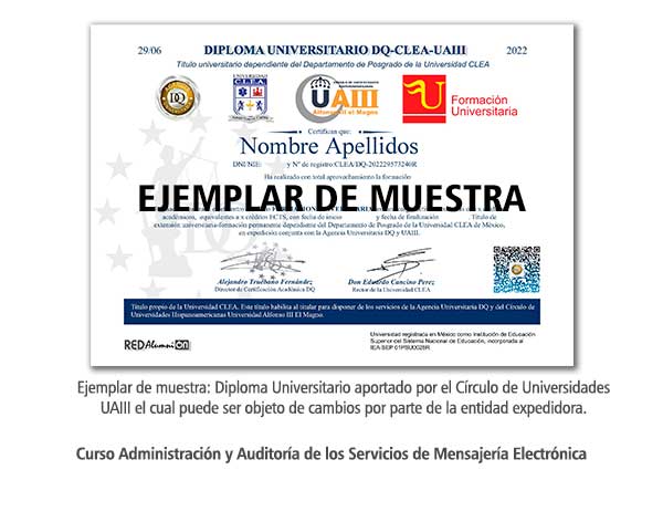*Una vez superado el Programa y previo pago de las tasas de expedición, el alumno podrá solicitar su Diploma-Título de formación permanente expedido por DQ Agencia Universitaria, el Círculo de Universidades UAIII y la Universidad CLEA. Curso perteneciente al Plan de Formación Permanente de la Universidad CLEA. Este Título Propio habilita al titular para disponer de los servicios de la Agencia Universitaria DQ, la Universidad CLEA y del Círculo de Universidades Hispanoamericanas Alfonso III el Magno. Enseñanza no oficial y no conducente a la obtención de un título con carácter oficial o certificado de profesionalidad. |